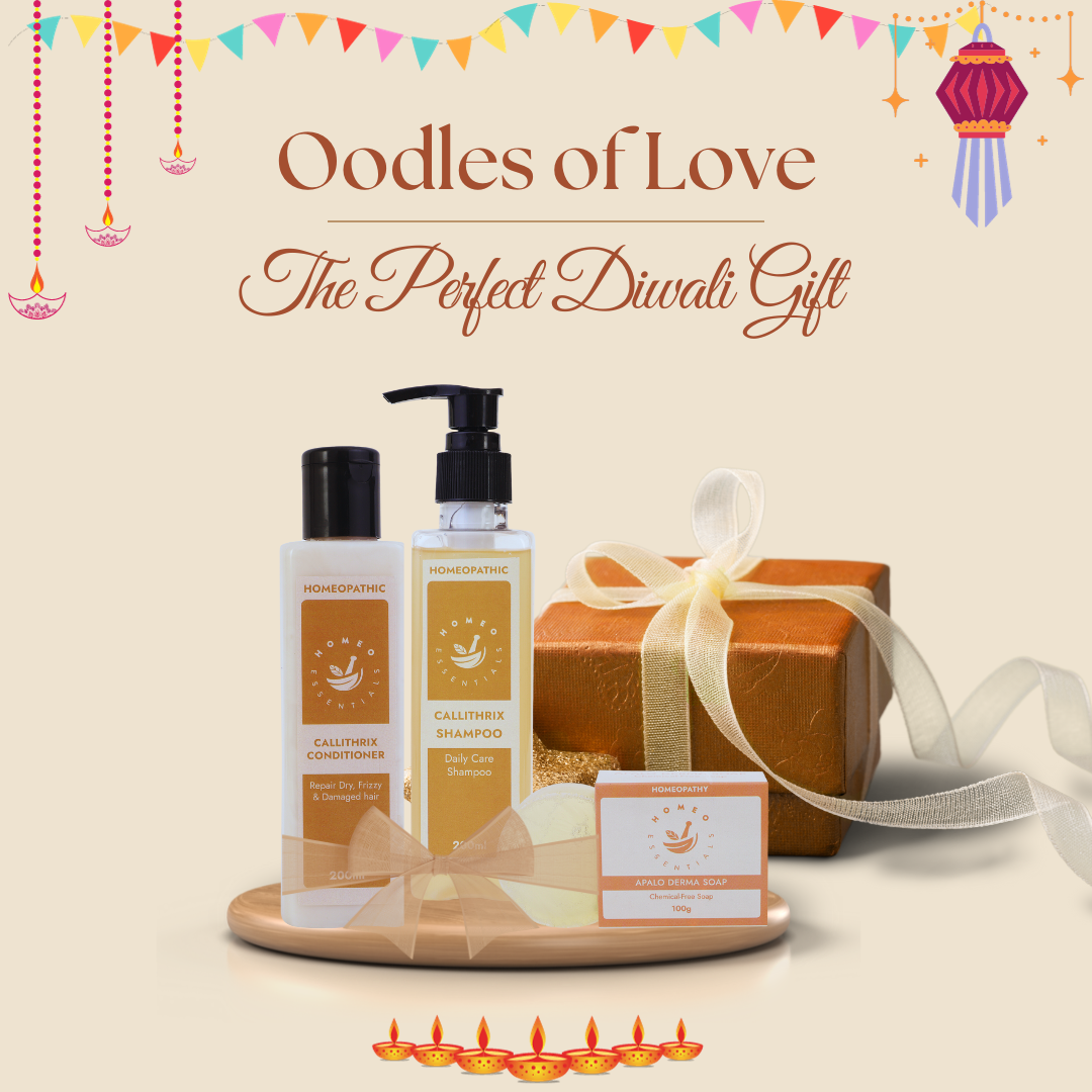 Oodles of Love is a Homeopathic Beauty Care Gift Box containing 1 unit each of Shampoo 200ml, Conditioner 200ml, and Soap 100g from Homeo Essentials.